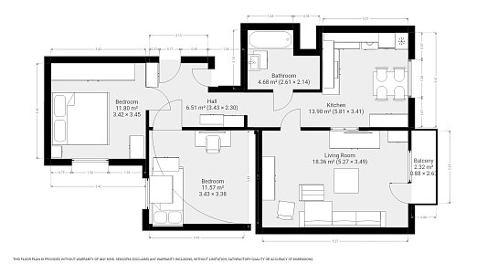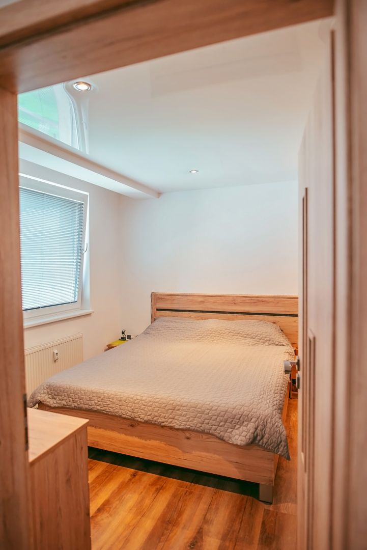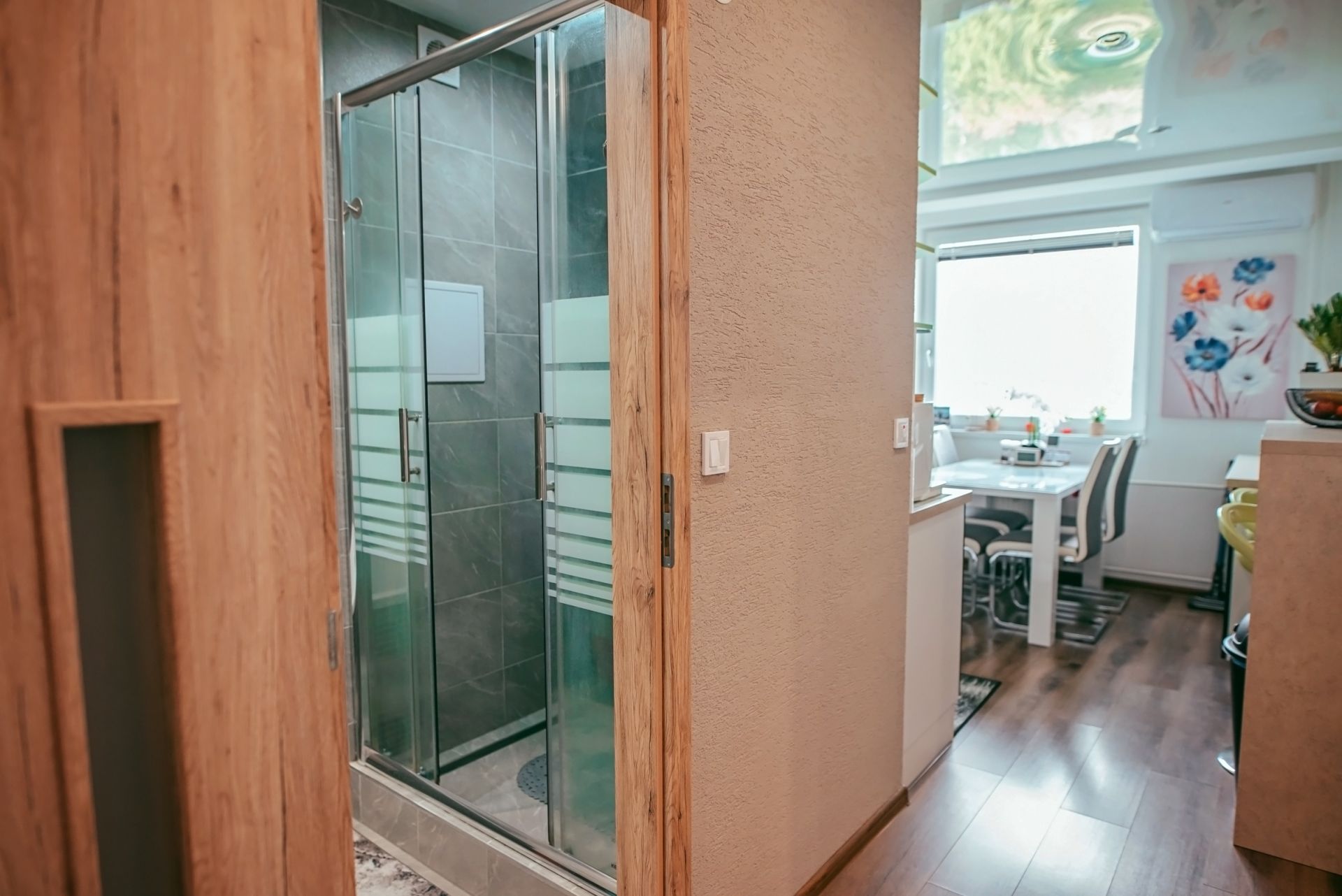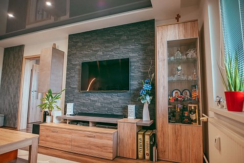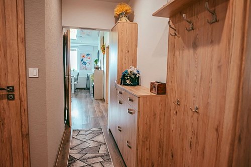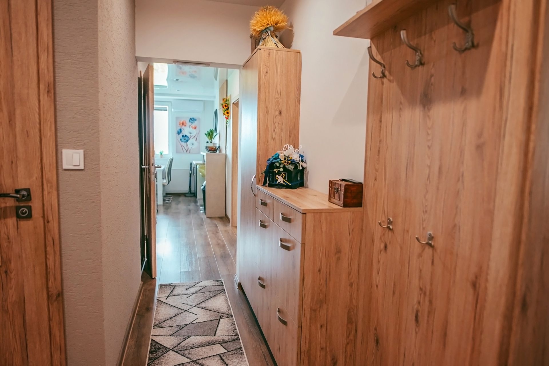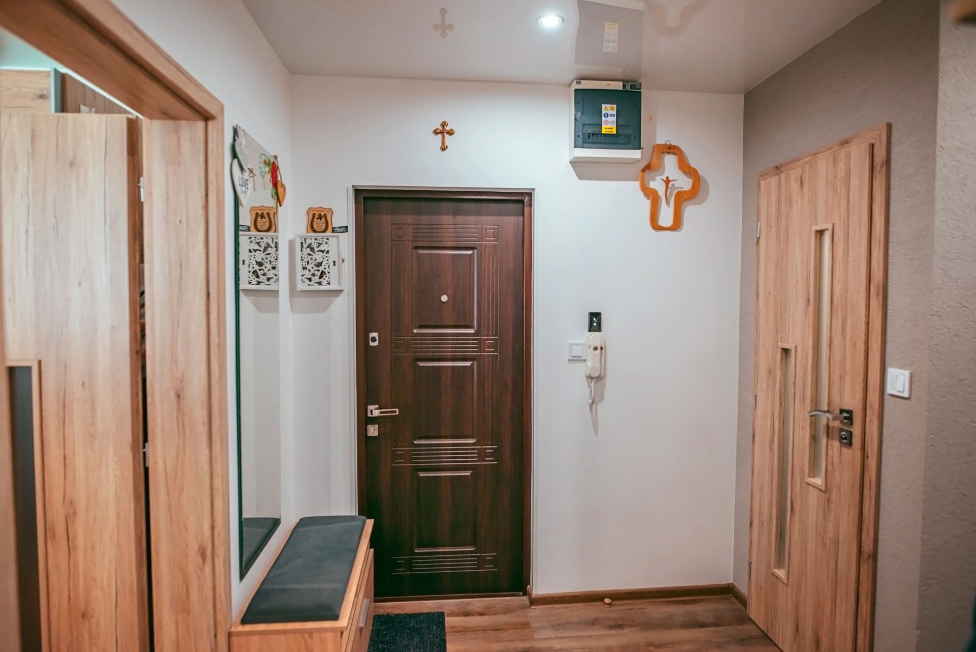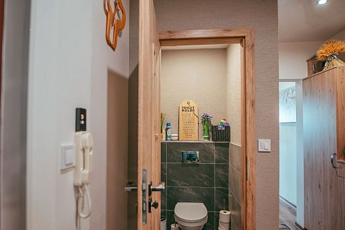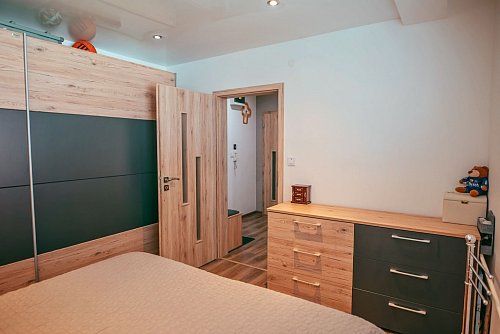 Byt je prakticky riešený a pozostáva z troch nepriechodných izieb, kúpeľne so sprchovacím kútom aj vaňou, samostatného WC a klimatizácie, ktorá vám spríjemní horúce letné dni. K dispozícii je aj murovaná pivnica s rozlohou 2,85 m² a spoločná kočikáreň, čo zvyšuje komfort bývania.
